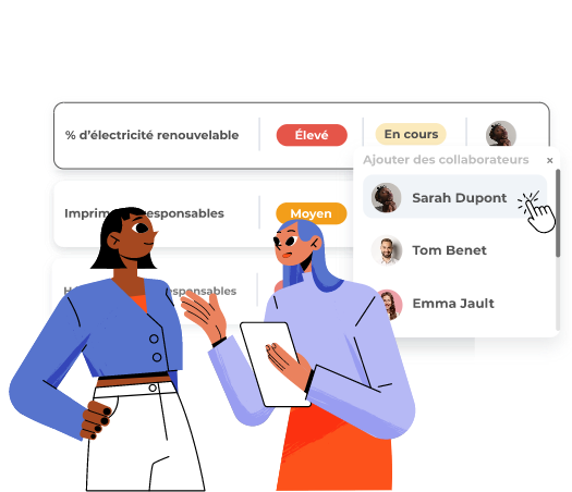 Construisez vos plans d’actions sur la base d’indicateurs ou actions alignées avec les référentiels et standard de votre choix, laissez Zei vous suggérer les plans d’actions adaptés à vos enjeux, invitez des contributeurs pour progresser au quotidien.